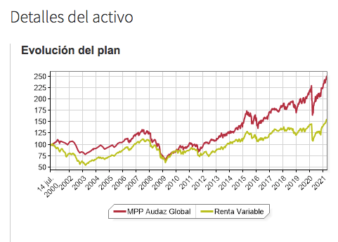 Para muestra un botón. En este gráfico puedes ver la evolución de un Plan de Pensiones REAL (MPP Audaz Global, de AXA). Tomando valor 100 como base de partida en el año 2000, actualmente se sitúa en un valor entorno a 250. Es decir, en 20 años los partícipes que invirtieron en dicho plan de pensiones han más que duplicado el valor de su inversión inicial. Pero, ojo, ¿todos los partícipes están así de contentos? La respuesta es NO. Tan sólo los que entendieron que su inversión era a largo plazo y, en base a ello, permanecieron invertidos todo este tiempo pese a que su inversión estuvo en determinados periodos por debajo del valor inicial (incluso rozando un 50% de pérdida potencial) pueden presumir de rentabilidad.